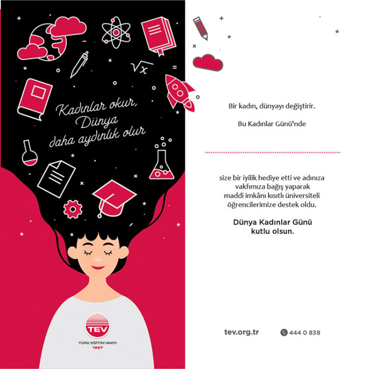 Türk Eğitim Vakfı (TEV), 8 Mart Dünya Kadınlar Günü kapsamında gençlerin eğitimine destek olmayı amaçlayan “Mutlu Gün Kartları” projesini hayata geçirdi. Bu özel kartlar, sevdikleriniz adına bağış yaparak eğitimde fırsat eşitliğine katkı sunma imkânı sağlıyor. 58 yıldır eğitim yolculuğunda gençlere destek olan TEV, 8 Mart’a özel hazırlanan kartlarla kadınların eğitimle güçlendiği bir geleceğe dikkat çekiyor. TEV Mutlu Gün Kartları, internet sitesi veya telefon üzerinden erişilebilen seçenekleriyle anlamlı ve kalıcı bir hediye alternatifi olarak öne çıkıyor.